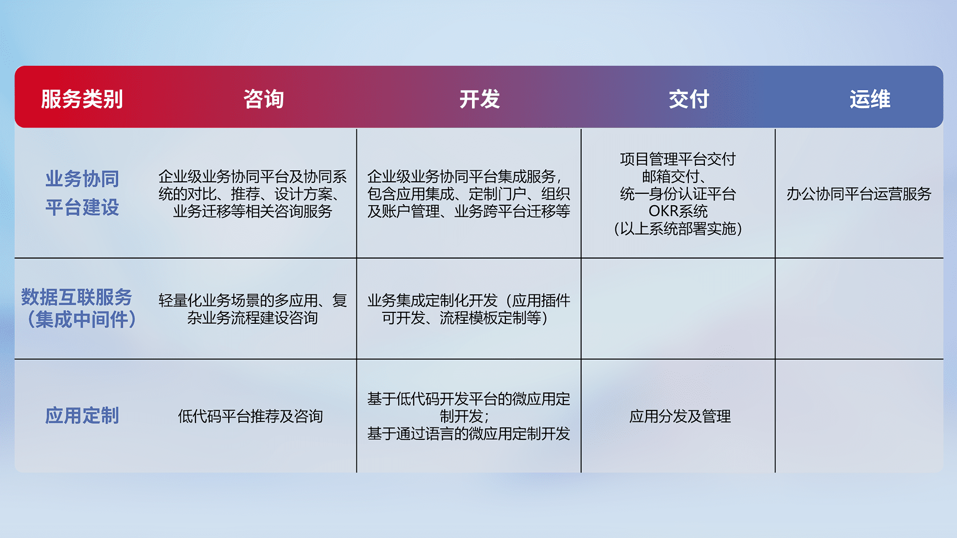 针对钉钉、、企微、、IDaas等平台级产品提供产品的规划、、、、方案、、交付、、、、定制化开发等服务,,,实现如统一协同办公、、、、智能客户服务、、混合会议管理、、智能数据查询、、等业务场景,,实现数字化转型。。